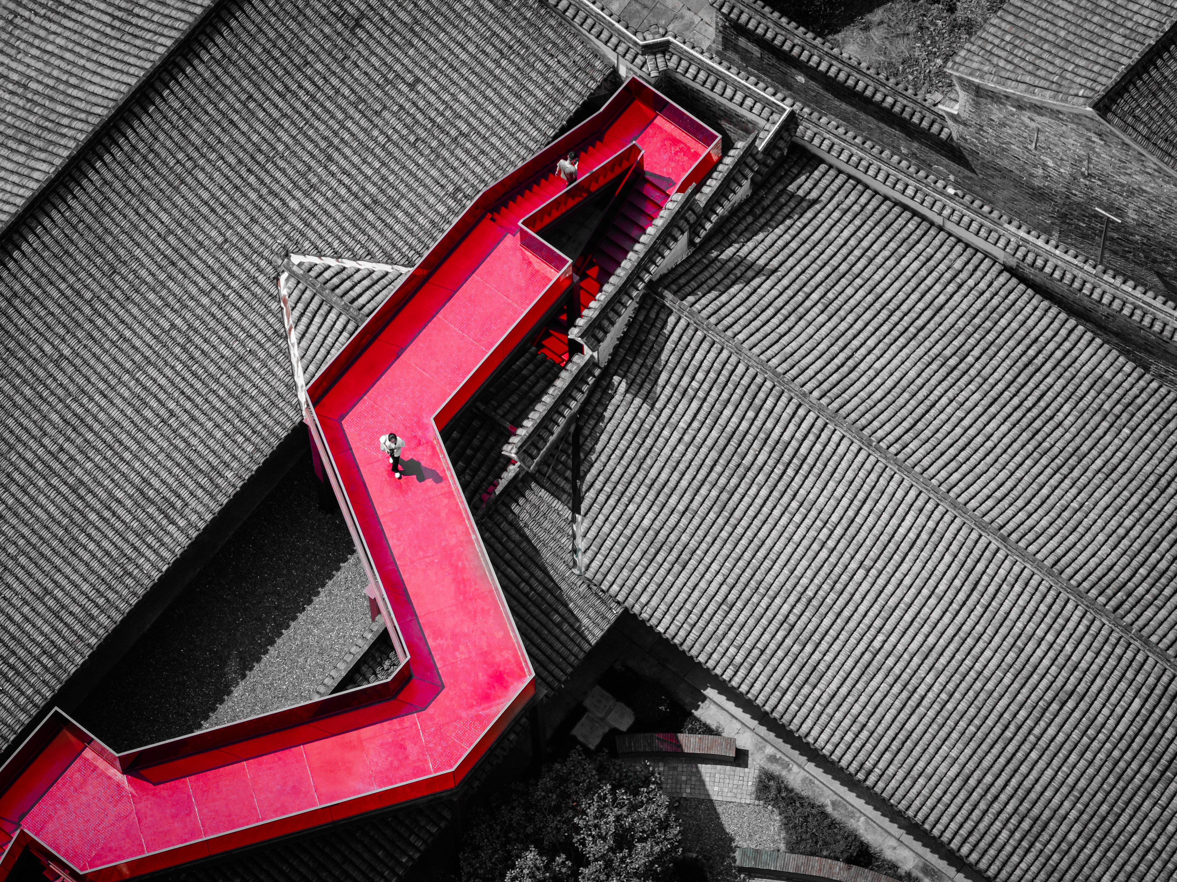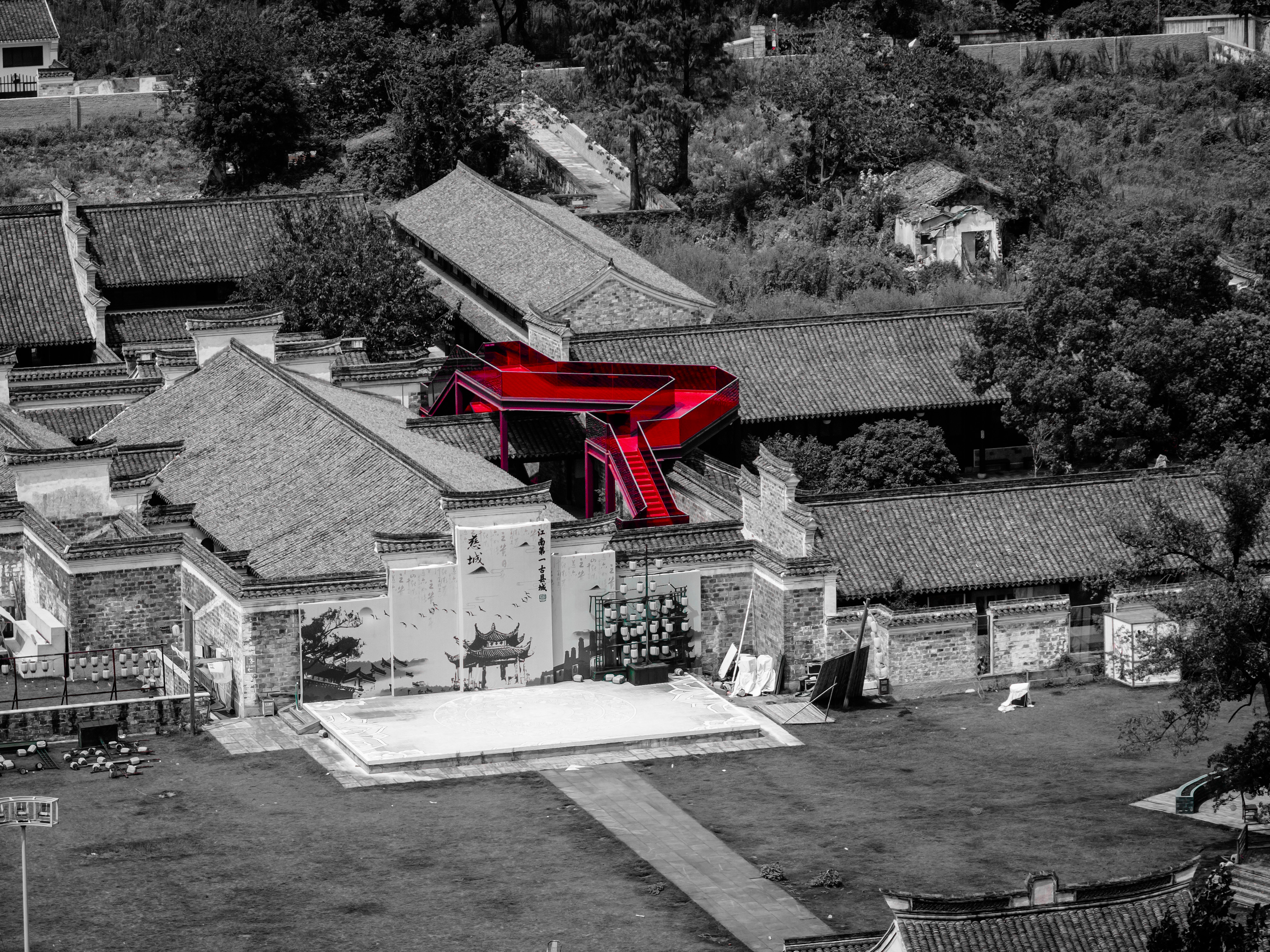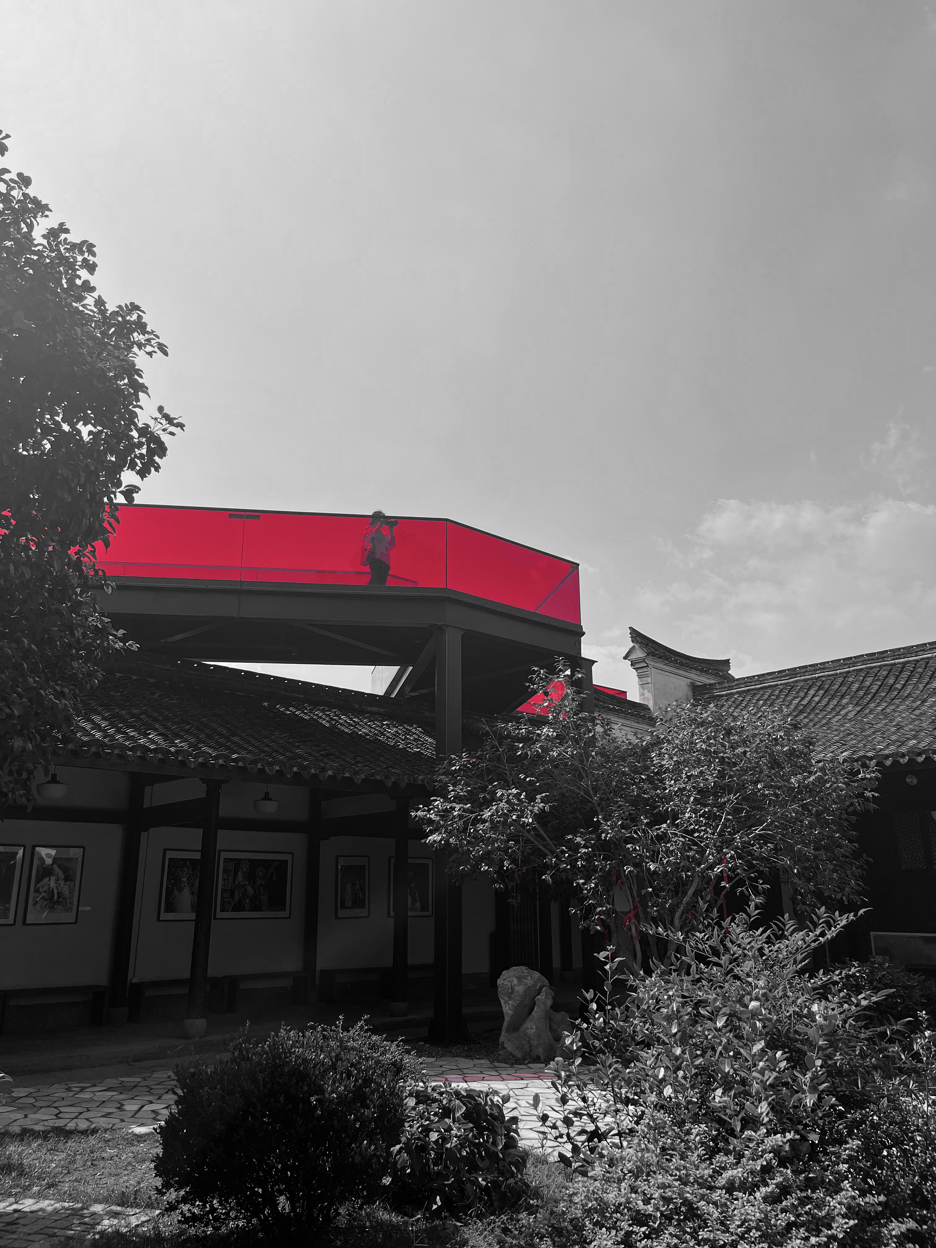 本作品的摄影地点为慈城内的周信芳戏剧艺术馆,信步馆中,一座从屋檐上方“横空出世”的红桥颇为亮眼。据了解,此红桥的设计师为宁波大学潘天寿艺术设计快手成人版 教授邵良,其设计理念就是将传统文化与现代艺术交融,从沉浸式、情景式的角度综合考虑全新的建筑功能。这座红桥不管从高度、材质、颜色、线条上都与原建筑风貌形成了一种对比,这即是一种视觉上的对比,亦是一种时代文明的碰撞,走上红桥,对每一个游客来说都是一种享受,看慈城古镇的全景,品古今传承之韵。
