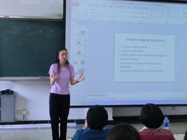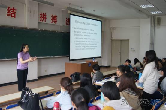 冯文教授采用讲授和对话相结合的方式,着重介绍了当前美国教育改革的现状及问题。在基础教育的报告中,冯教授分别从学校类型、课程设置、制度与政策等方面为大家介绍了美国基础教育改革的出发点及具体措施,使师生们对美国基础教育的公平原则和个性化教育理念有了更深刻的理解。在高等教育专题中,冯教授就学生们比较感兴趣的大学类型、入学标准、申请条件等方面阐述了美国高等学校招生考试制度的特点。冯教授在表达学术见解的同时,还以风趣幽默的语言讲述了自己在美国学习工作的经历,引发了在场师生们的阵阵掌声与笑声。报告期间,老师和同学纷纷积极与冯教授进行双语形式的互动交流,冯教授对师生的提问逐一进行了耐心解答。