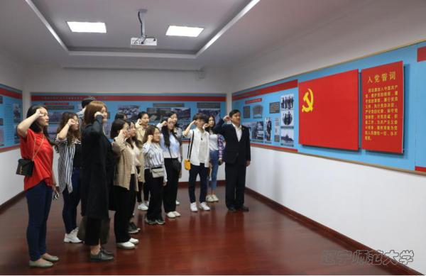 随后党支部成员走进馆内,从第一展室开始进行参观。党支部成员尝试通过二维码播放手机内的语音讲解的方式,共同了解那段战火纷飞的历史。之后由党支部书记乔冬老师带领大家重温入党誓词,不忘入党初心。当右拳置于耳畔时,面对庄穆党旗,在先辈的见证下,党支部成员再次庄严宣誓。