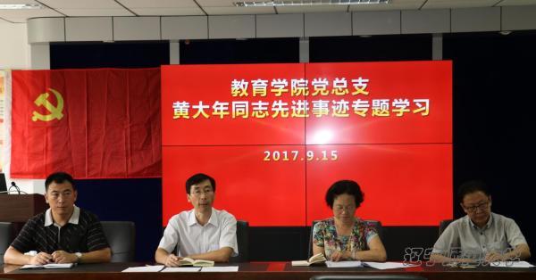 2017年9月15日下午,教育学院党总支组织全体教职工集中学习黄大年同志先进事迹。会上,党总支书记邓天鹏传达学习了《中共中央关于追授黄大年同志“全国优秀共产党员”称号的决定》和习近平总书记对黄大年同志先进事迹作出的重要指示。随后,全体人员观看了《黄大年同志先进事迹》报告会视频。