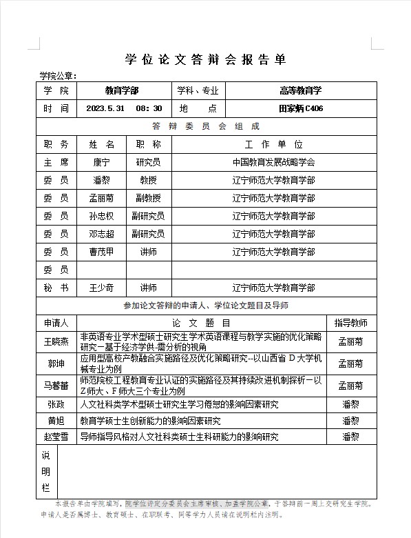 2023年学位论文答辩报告单公示
