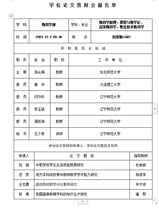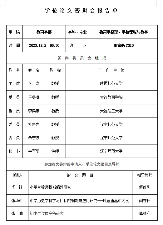 2023年下半年硕士学位论文答辩会报告单公示