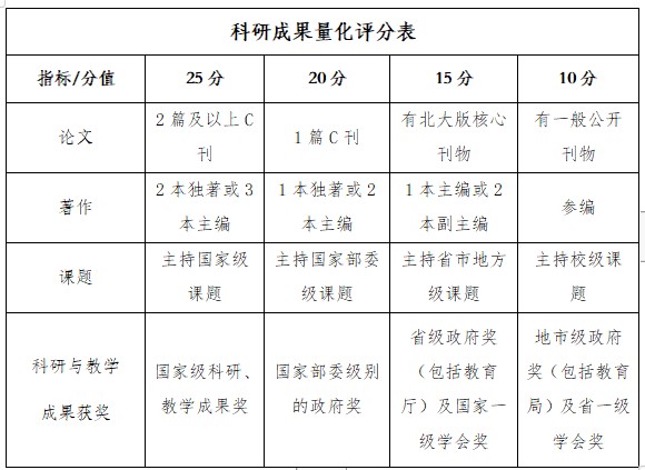 学部根据科研成果量化评分标准(见下表),对申请者提交的科研成果材料进行考核。按照考生的科研成果成绩从高到低进行排序,并按各导师招生人数1:3比例确定进入综合能力考核的考生名单。当入围名单最后一名出现并列时,即考生科研量化成绩相同时,学部学术委员会根据考生成果与所报专业的吻合度、成果等级、考生个人经历、培养前景等方面综合考评,确定进入“综合考核”名单。科研成果量化成绩满分100分,教育领导与管理专业领域低于30分不得进入综合考核,学校课程与教学专业领域低于25分不得进入综合考核,计入总成绩,由研招办统一进行公布。